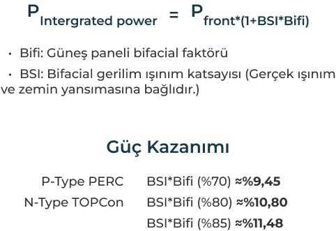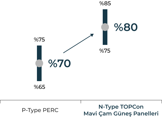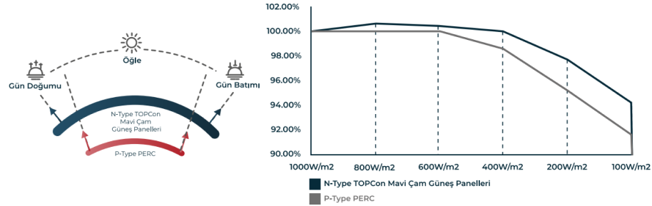 P-Type PERC güneş panelleri ile karşılaştırıldığında N-Type TOPCon güneş panelleri düşük ışıkta (600W/m2 ve altında) daha iyi performans göstermektedir. Bu durum enerji üretim süresinin sabah ve aksam yaklaşık 1 saat kadar uzamasını sağlar.