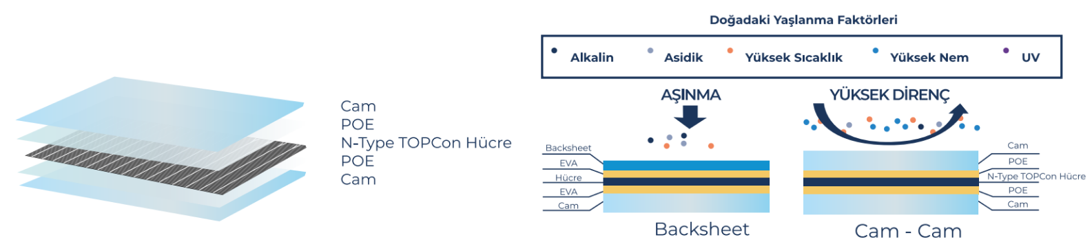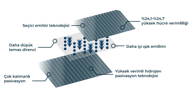 TOPCon (Tunnel Oxide Passivated Contact) hücreler konvansiyonel yapının arkasına ince bir tünel oksit tabakası ekleyerek hücrenin elektron toplama verimliliğini ve hücre performansını artırmaktadır. TOPCon hücrelerin N-Type yapısı, düşük güç kayıpları, PID ve LID gibi olumsuz etkilere direnç, uzun ömürlülük ve düşük ışık koşullarında daha iyi performans sunmaktadır.