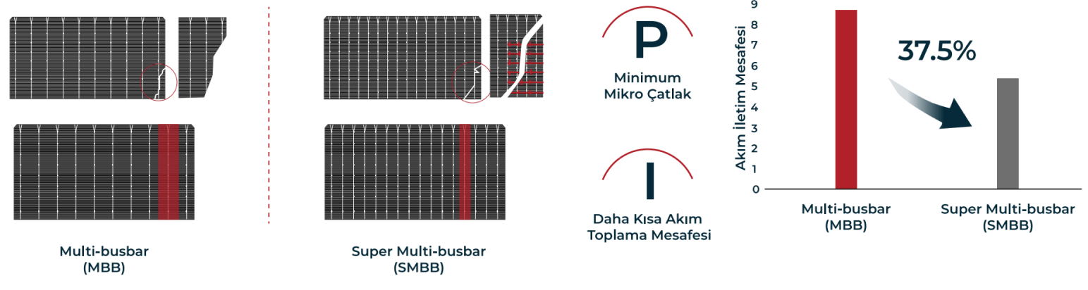 16 Busbar hücrelerin üzerindeki daha ince finger yapısı akim toplama mesafesini ve lehimleme gerilimini en aza indirmek için tasarlanmıştır. Tüm iyileştirmeler mikro çatlak kaybını önemli ölçüde azaltmakta ve hücrenin çıkış gücünü artırmaktadır.