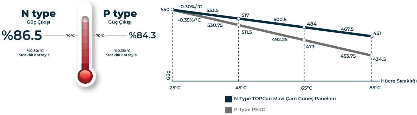 N-Type TOPCon güneş panellerinin düşük sıcaklık katsayısı sayesinde güç çıkışı P-Type PERC güneş panellerine göre %75 daha yüksektir. Ayni ortam koşullarında Mavi Çam Güneş Panelleri’nin çalışma sıcaklığı P-Type güneş panellerine göre >1% daha düşüktür. Yüksek sıcaklık koşulları altında Mavi Çam Güneş Panelleri ~%2 daha avantajlıdır.