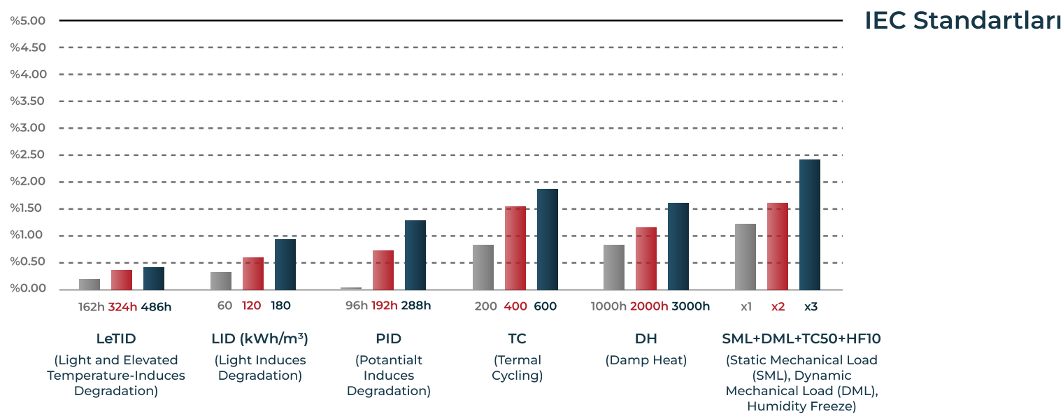 N-Type TOPCon güneş panelleri IEC test standartlarına göre çeşitli zorlaştırılmış testlerden geçirilmiş ve %5 limitinin çok altındaki sonuçlarıyla olağanüstü performans göstermiştir.