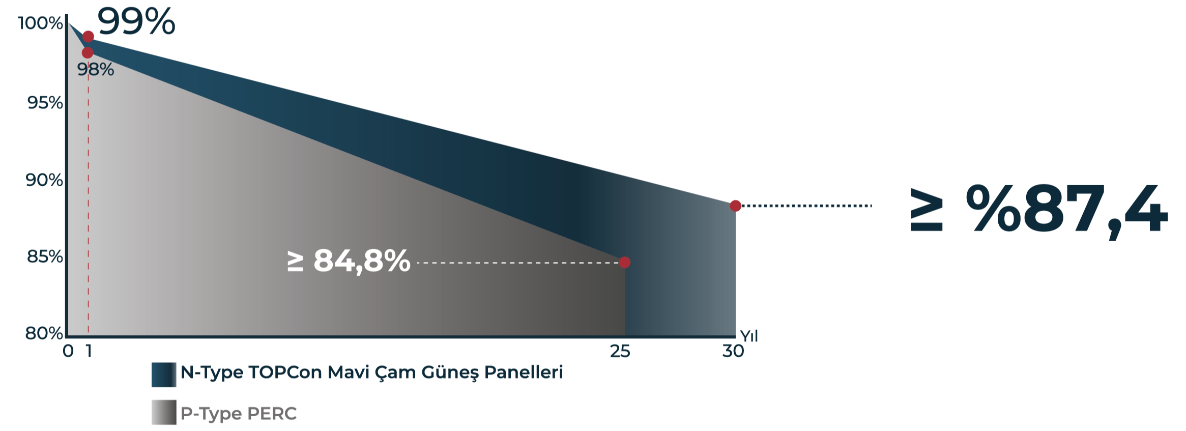 Mavi Çam Güneş Panelleri’nin cam-cam yapısı, daha yüksek güç, bifaciality özelliği, zor koşullarda etkili üretim ve düşük bozunma sağlayarak, P-Type PERC güneş panellerine kıyasla 30 yıllık kullanım süresince her bir watt başına önemli ölçüde daha fazla güç [kWh/kW] üretmenizi sağlar. Ayrıca, LID ve LeTID etkileri olmaması da dikkate değer bir avantajdır.